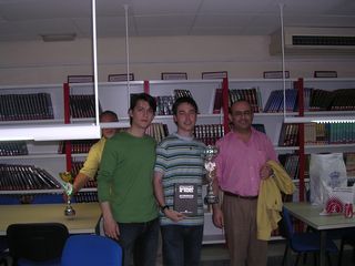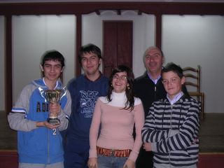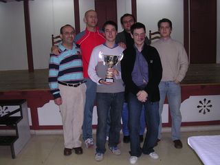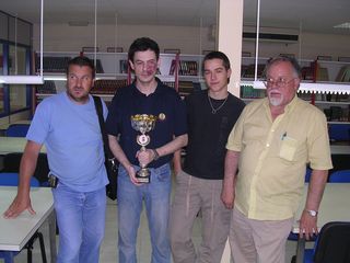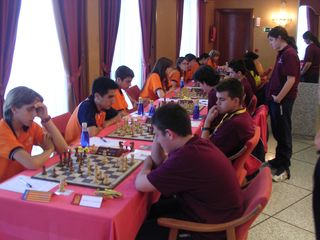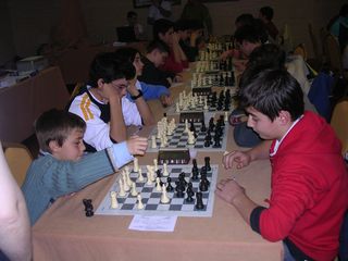 | El pasado día 19 de febrero se jugaron las tres últimas rondas del campeonato escolar 2006. La clasificación general dejó a Angel Espinosa que ganó las 10 partidas q se disputaron y con punto y medio de ventaja sobre el 2º clasificado Jeus Peña. En categoría femenina ganó Irene Palacios con 6.5 y por solo 2.5 puntos de desempate con Gema Peña. La clasificación por equipos fue 1º Almagro, 2º Valdepeñas y 3º Tomelloso. En los próximos días pondre un reportaje fotográfico. Para ver la clasificación entera, los resultados de la última ronda y la clasificación por equipos pincha aqui |